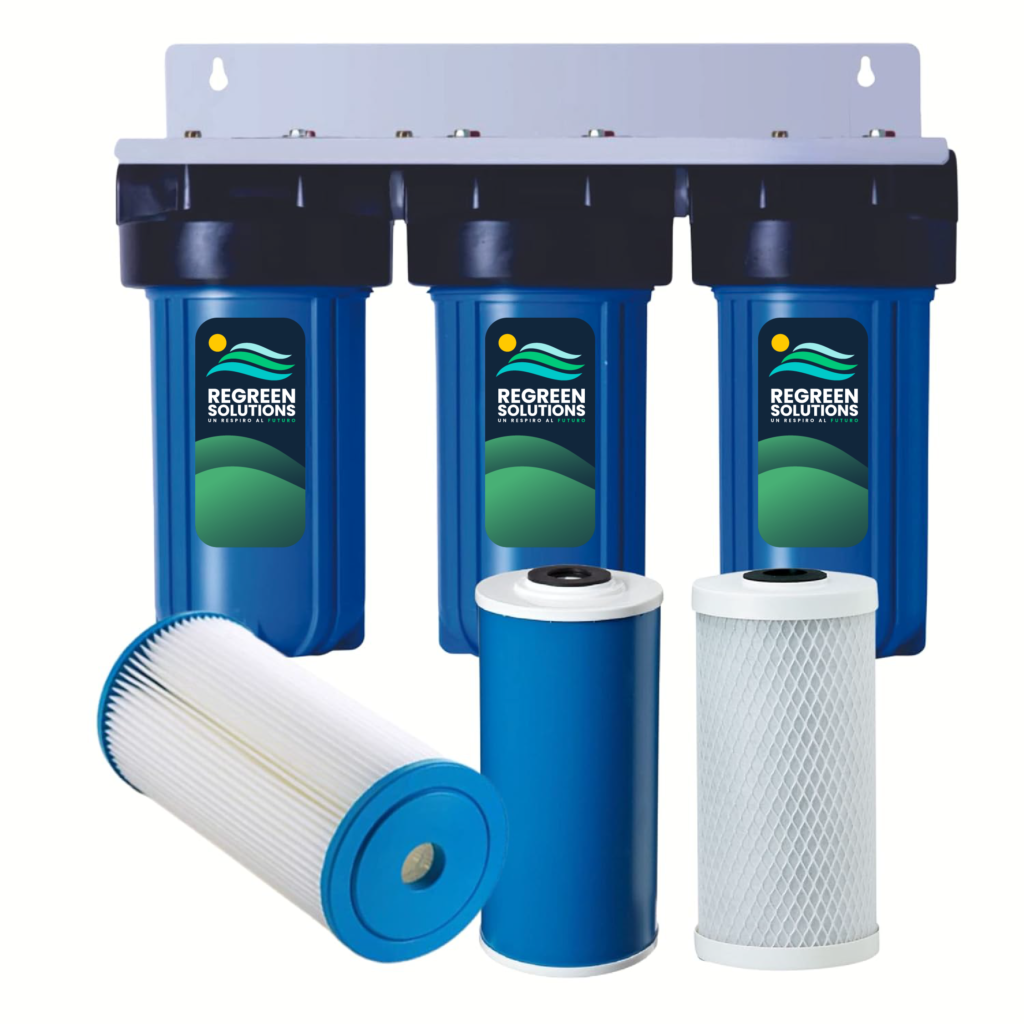 3 piezas | Portacartuchos azul 4.5 x 10 de 1" PURIKOR 1 pieza | Cartucho Polipropileno SPUN 4.5 x 10.5 MICRAS PURIKOR 1 pieza | Cartucho Carbon Activado de 10" x 4.5 MICRAS AUEX 1 pieza | Cartucho Activado Granular de 10.5 x 4.5 MICRAS AQUEX 3 piezas | Mensual sencilla para Big Blue